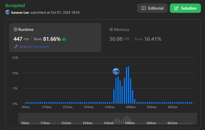 위 코드는 nums 배열 안에서 중복된 요소들을 잘 다루지 못했고, 또 배열의 길이가 2인 경우에 적용할 수가 없었습니다.. 수업 자료와 필기를 보면서 다시 한 번 공부를 했고, leetcode에 올라와있는 솔루션을 참고하기도 했습니다. 이후 다음과 같이 코드를 작성해보았습니다.